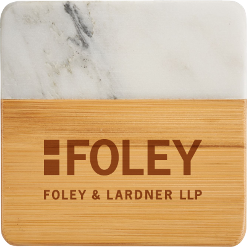 Each item in the four-piece Marble and Bamboo Coaster Set is square with rounded corners, perfect for your coffee table, office desk, or nightstand. Natural variations in the marble give each piece a unique, hand-crafted look, making these coasters truly one-of-a-kind. Due to the nature of the bamboo material, variations in laser imprinting quality may occur.